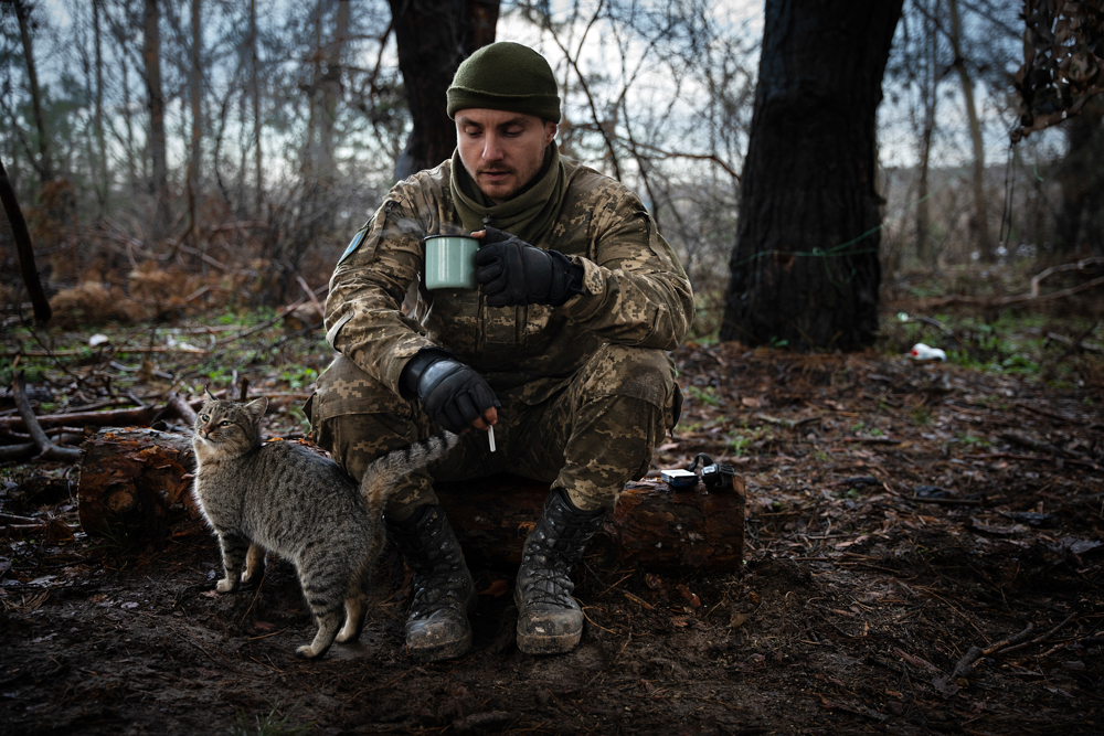 Un soldat, ambulancier du 63e régiment mécanisé, prend son café du matin en compagnie du chat de l’unité. Forêt de Serebryansky, région de Louhansk, 26 octobre 2023