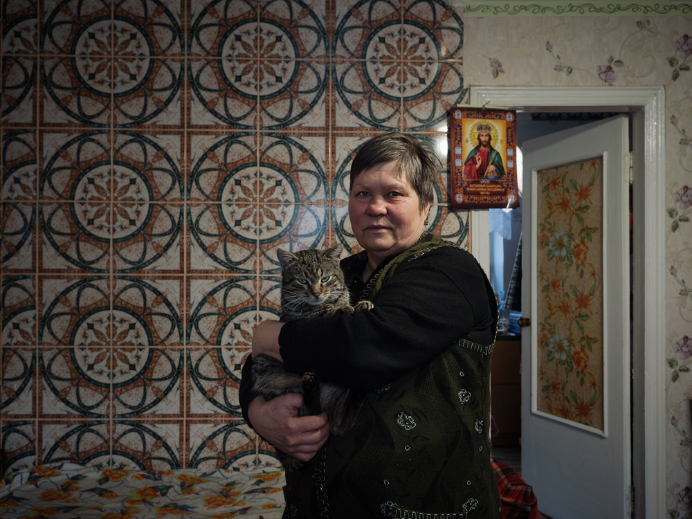 Nelli Platitsena serre dans ses bras Bac, l’un de ses trois chats qu’elle a réussi à sauver du bombardement de son village, Neveleske. Mi- Novembre 2021, les forces séparatistes et russes ont littéralement pilonné ce bourg de 45 habitants. Nelli a tout perdu et son 4e chat a été retrouvé éventré par les éclats devant les ruines de sa maison. Région de Donetsk, 5 février 2022